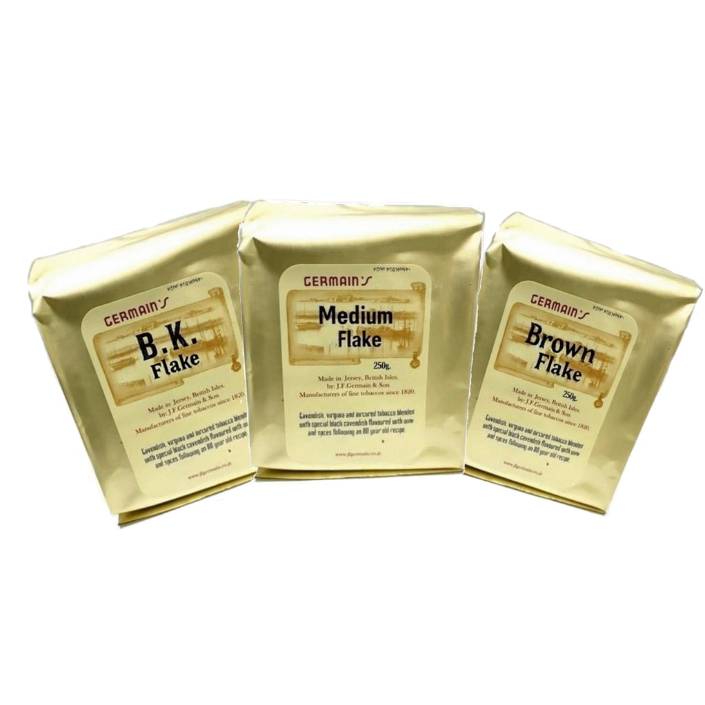 The Germain’s Medium Flake is a rich, dark brown flake crafted from a blend of Red, Brown, and Gold Virginias combined with Kentucky tobacco leaves.
